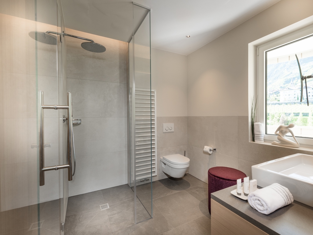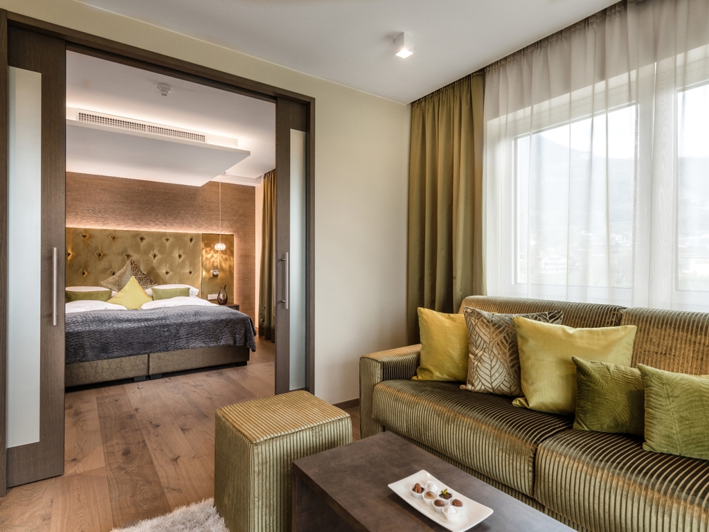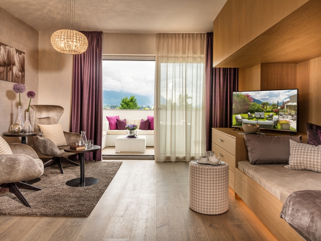 Modern fashionable Guest room (28m²), northside balcony (+7m²) facing the mountains and the village Tirol, living area, desk, natural wood parquet, minibar, safe, TV with radio, SuitePad, WLAN, bathroom with window, shower, hair-dryer, bathrobes, air conditioning