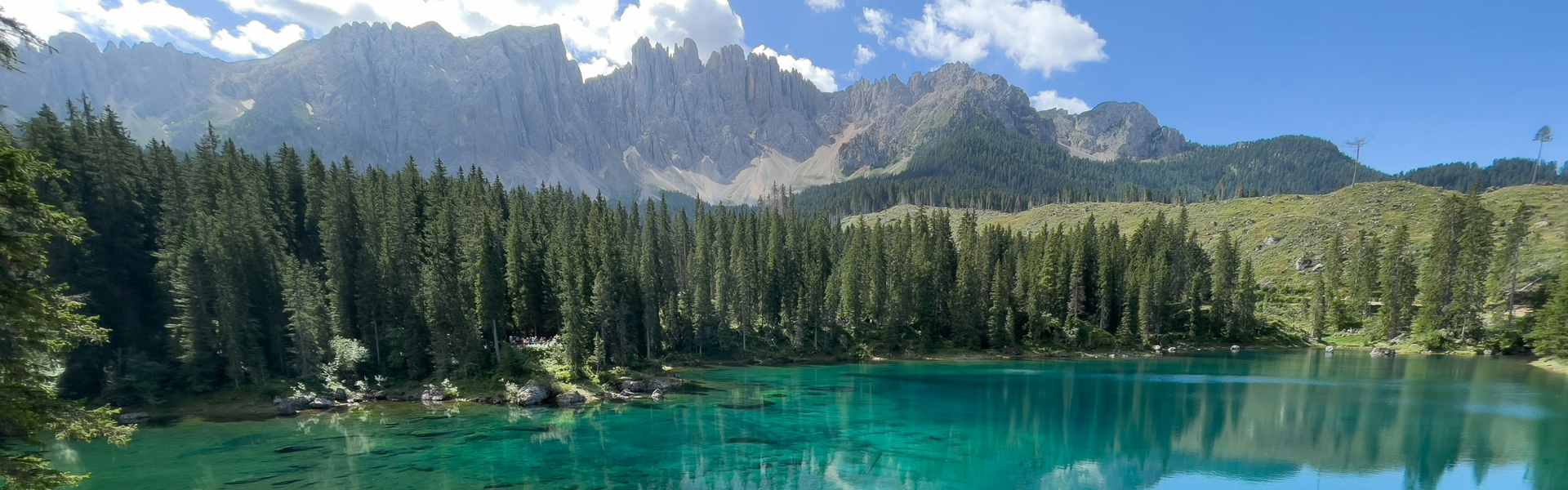 Deep in the South Tyrolean Dolomites, at 1.500 meters height, lies the mythical lake Karersee. The crystal-clear water mirrors Mt. Rosengarten and Latemar, a spectacle that has enthused so far every visitor. When the water level sinks in summer, one can witness the sandbank where the mermaid of Lake Karersee used to lay to soak up the sun. Enchanted by her incomparable beauty, an evil sorcerer tried to catch her. To succeed in his plan, he created a ravishing rainbow, reaching from the lake all the way to the summits of Latemar. Fascinated by this play of colours, she approached. However, when she saw the evil sorcerer, she disappeared to the depths of the water and was seen no more. Disappointed and angry the sorcerer destroyed the rainbow. All its parts fell into the water, which since then impresses visitors with its kaleidoscopic beauty.