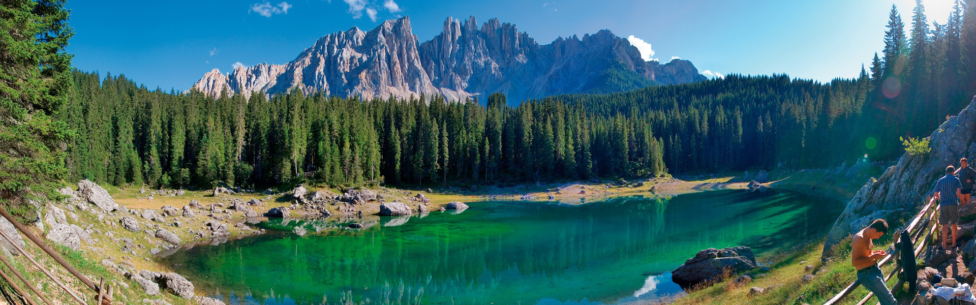 The mountain village Welschnofen lies in the midst of alpine pastures and profound coniferous forests. Those who follow the “Fairy-Tale Walk” arrive at one of the most beautiful lakes in the country, the Lake Karersee. The crystal-clear water mirrors Mt. Rosengarten and Latemar in in the early morning and evening hours. The incomparable beauty of the lake led to its long history of source of inspiration for artists and visitors. One of the most known Dolomite-myths tells about the mermaid of Karersee and how it happened that the lake shimmers today in all colours of the rainbow.