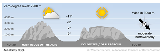 Most of South Tyrol will enjoy another clear, sunny day, with only a few clouds arriving on the main alpine crest as the day progresses.